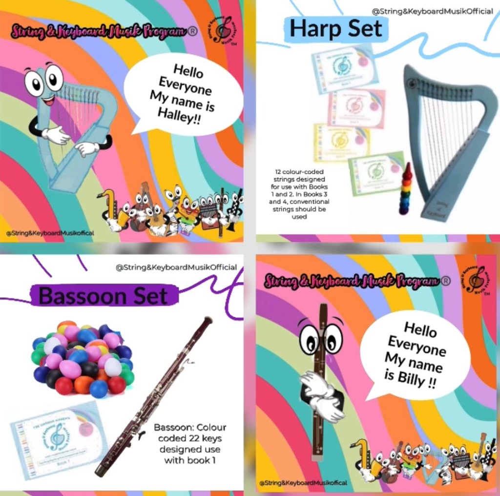 Harp: 12 colour-coded strings designed for use with Books 1 and 2. In Books 3 and 4, conventional strings should be used
