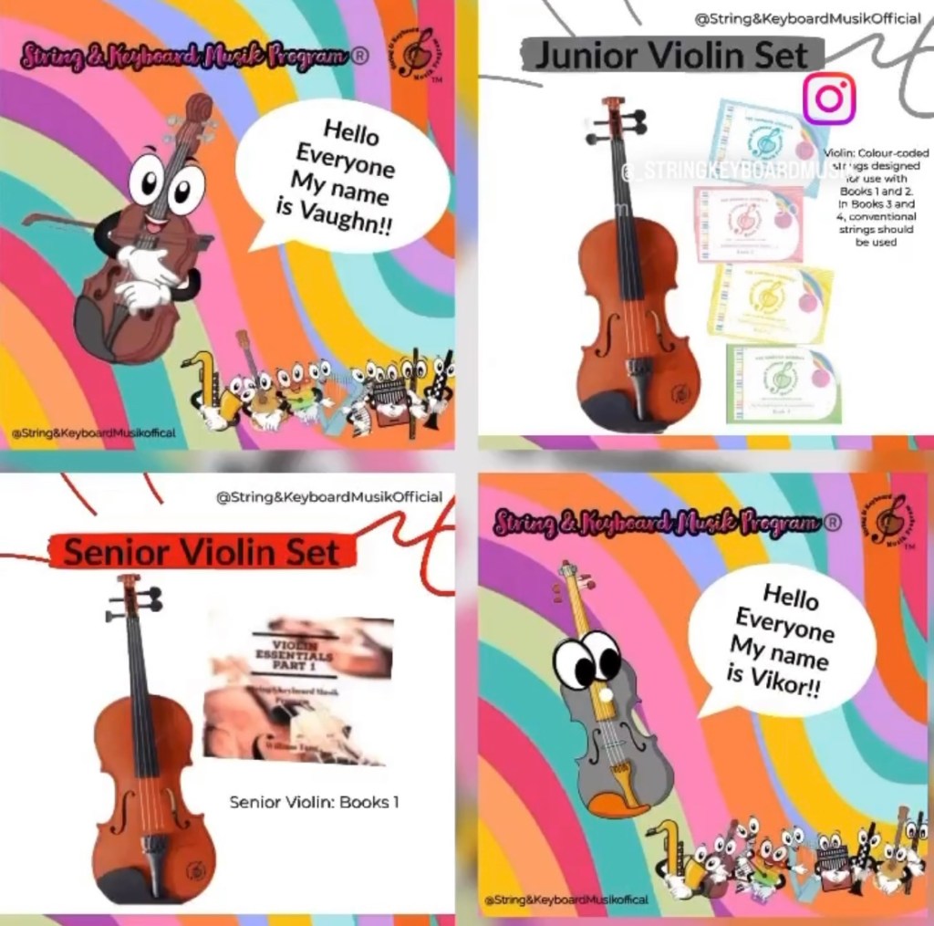 Violin: Colour-coded strings designed for use with Books 1 and 2. In Books 3 and 4, conventional strings should be used